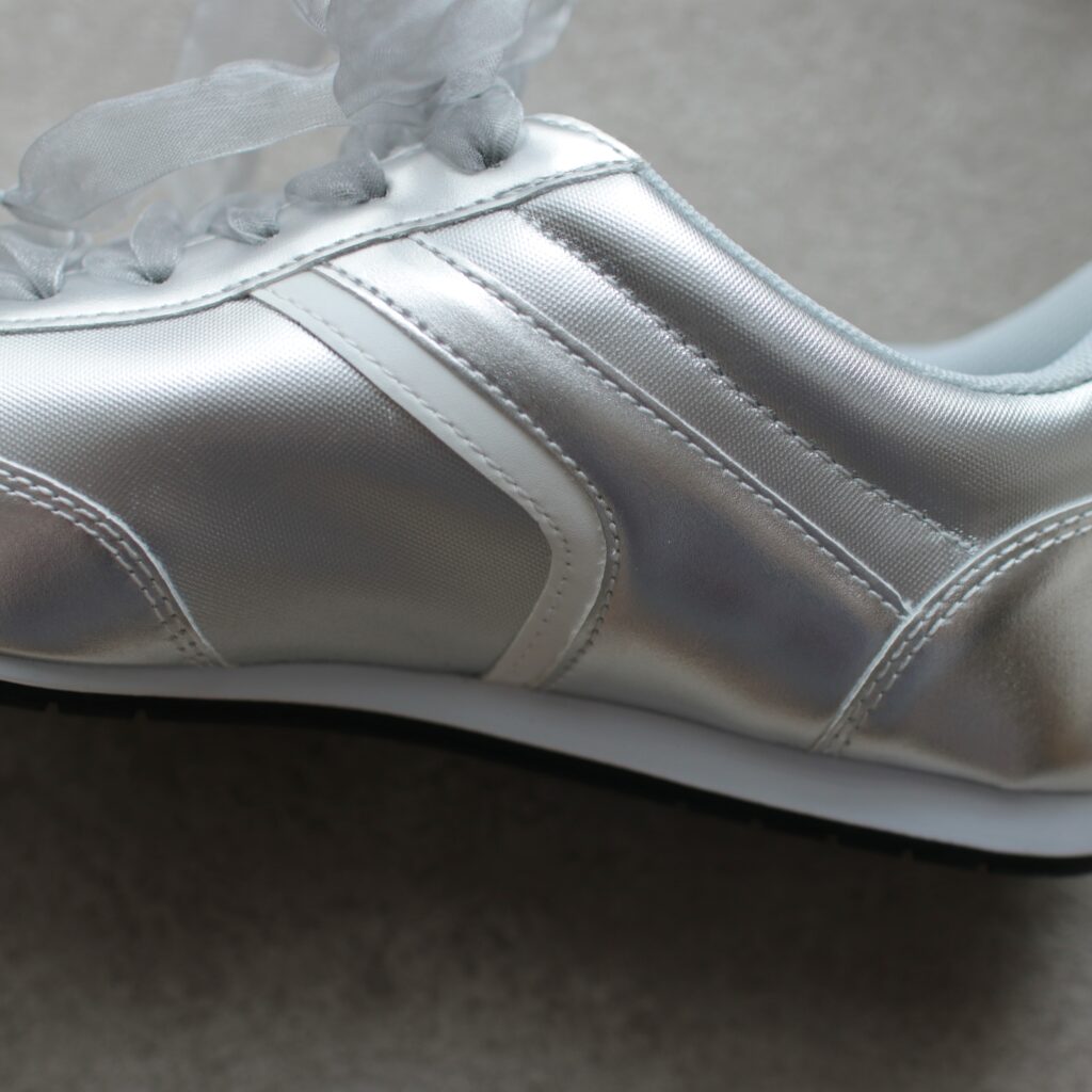 近年は厚底の靴が流行っている印象ですが、こちらは薄底タイプ。足元にボリュームが出過ぎないですし、そして艶はなくマットなシルバーなので、ギラギラし過ぎず大人でも履きやすいかなと思います。