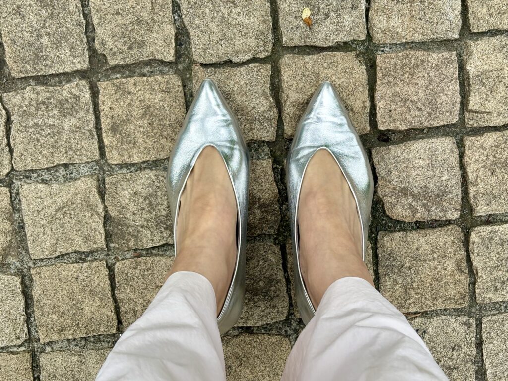 靴はルタロンで購入した、シルバーパンプス。