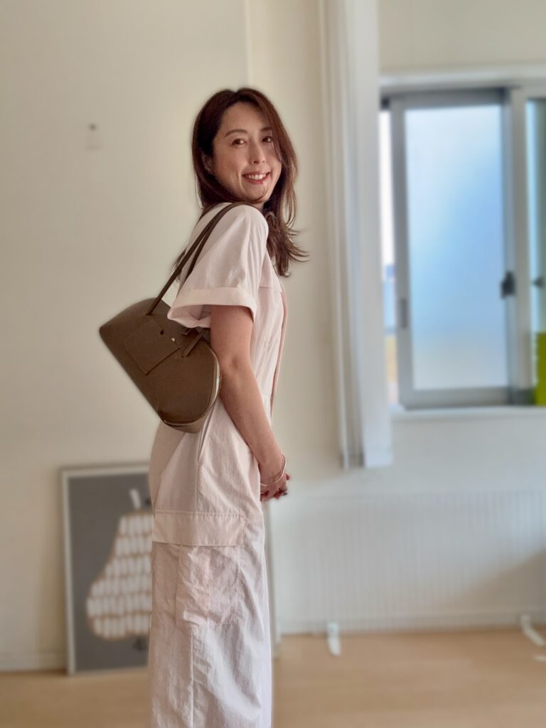 ジャンプスーツのスナップボタンがシルバーなので、アクセやバッグの金具もシルバーで統一しています。