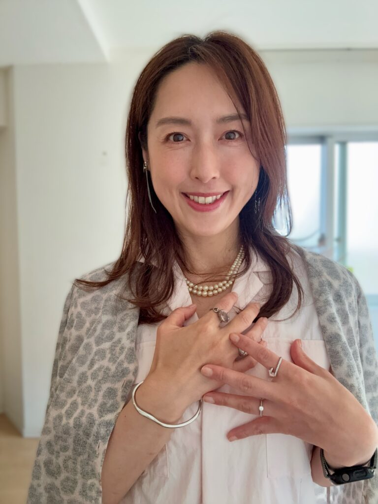 ジャンプスーツがいわゆる「ツナギ」の形なので、それ以外のアイテムは女性らしいものをふんだんに取り入れるようにしています。アクセサリーはジャラ付けします。リングも大ぶりな存在感のあるものをいくつか。
