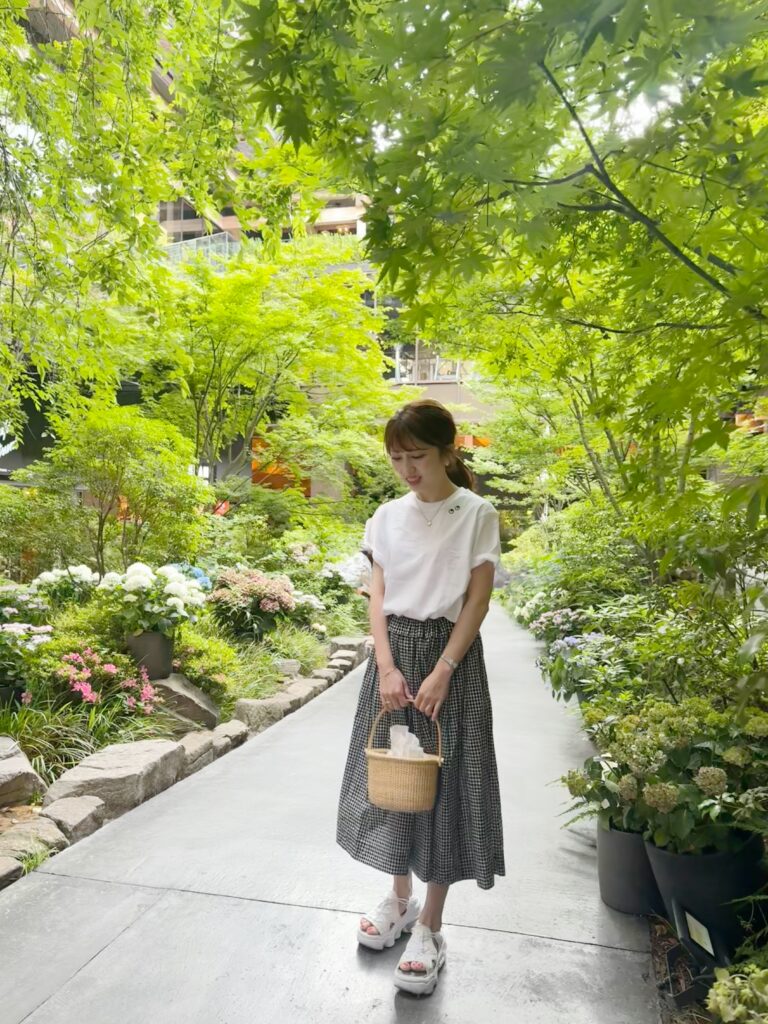 合わせたのは、さりげない花柄がポイントの黒×白のギンガムチェックのスカート👗(Handmade:リバティプリント)