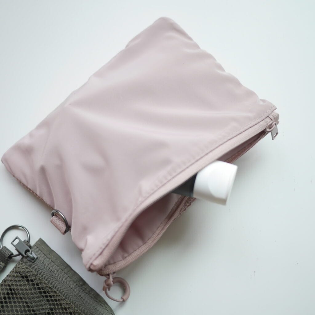 くすみピンクが可愛いMサイズのケース。ケースというかコスメ入れにもぴったりのポーチ♪