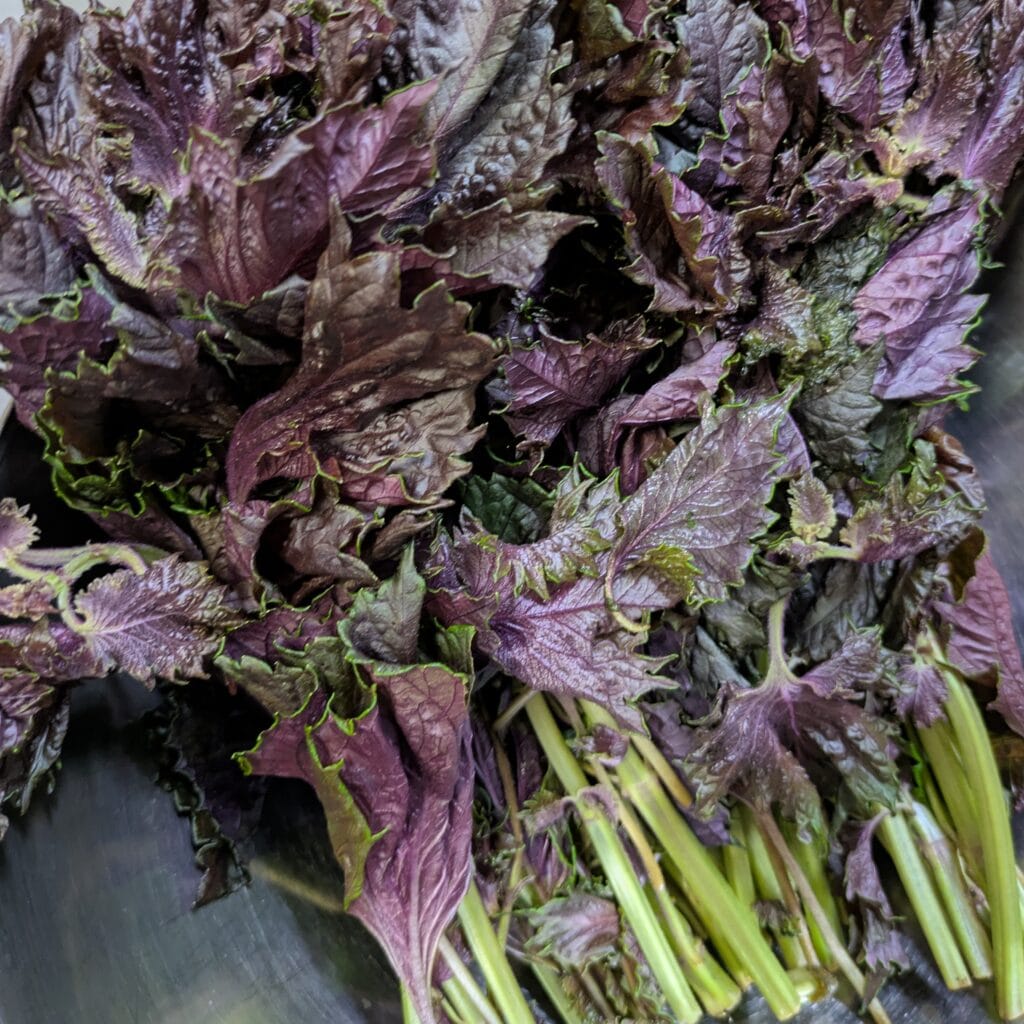 今の時期、わさっと店頭に並ぶ赤しそ。