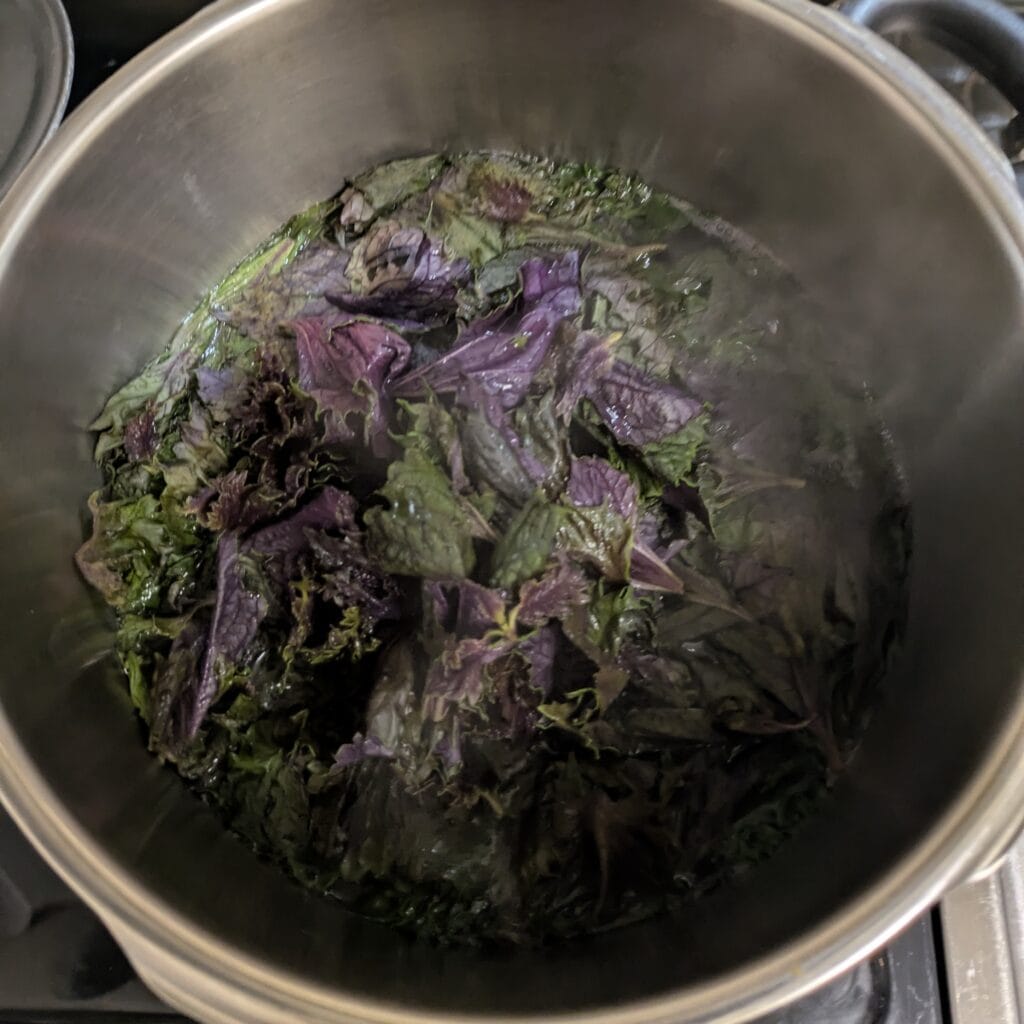 洗ったら、水1リットル沸かして赤しそ投入。