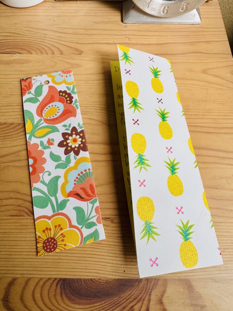 ノリ付けしてパンチでバチンと穴を開け、リボンを通したらしおりの出来上がり。それだけ😆