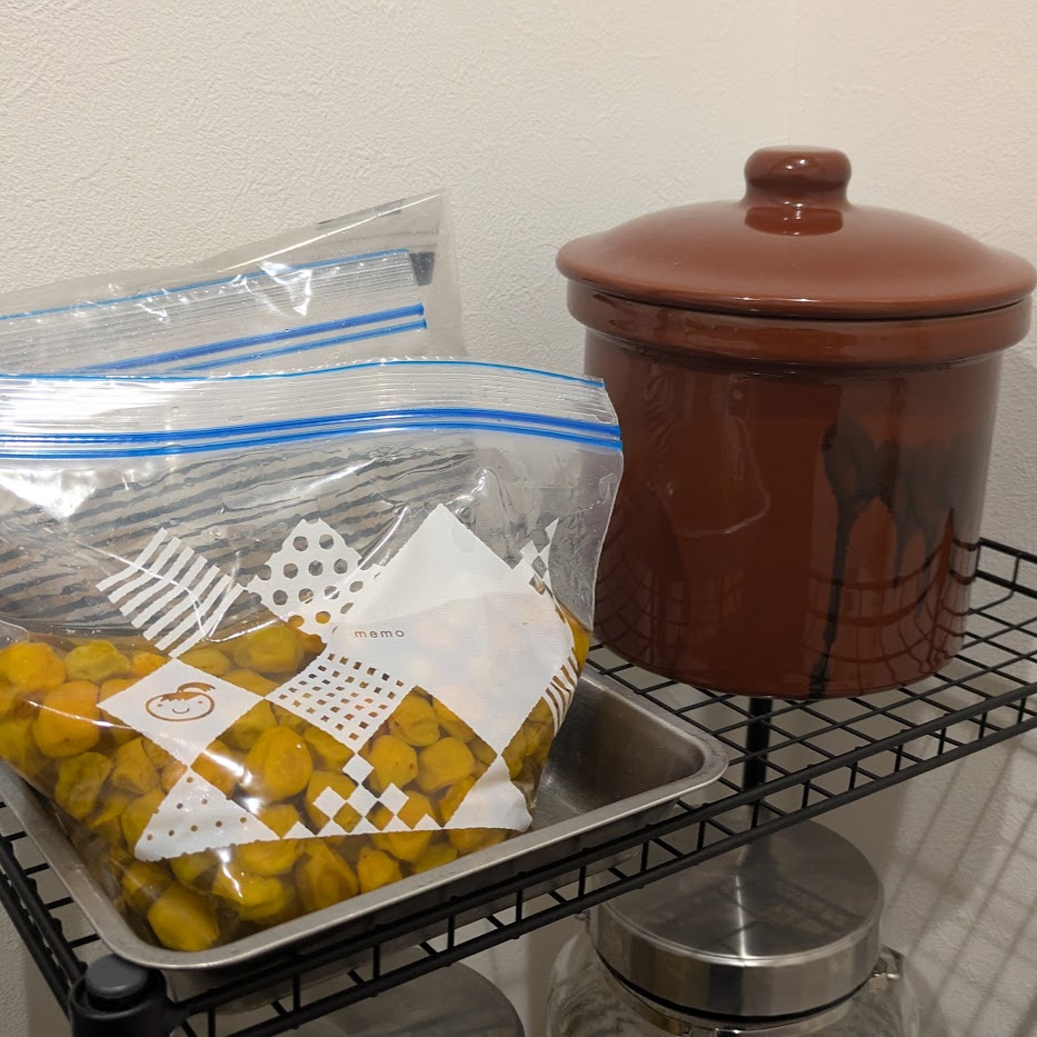 近くのJAで購入した傷あり青梅は一袋200円!2袋購入して、一番上の段で追熟。小梅は一袋300円、大きめ青梅は450円と激安価格。完熟梅が好きなので、追熟作業の場所確保に頭を悩ましていましたが、最近パントリーの一角を梅エリアにしてみました。