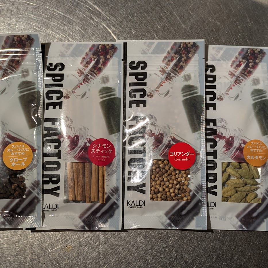 と同じみたいで、冷蔵保存と常温保存が違うみたいなので(個人の感想です)まずはスパイスをKALDIで購入してきました。一つ160円前後でホールスパイスが販売されていました。欲を言えばスパイスをそんなにお料理に使うわけではないので、