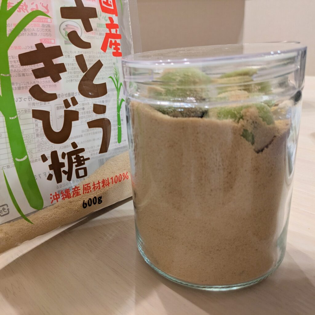 めちゃめちゃ簡単!今回はさとうきび糖と氷砂糖を混ぜて作ってみました。(毎日砂糖の量にビビってしまう🫣)