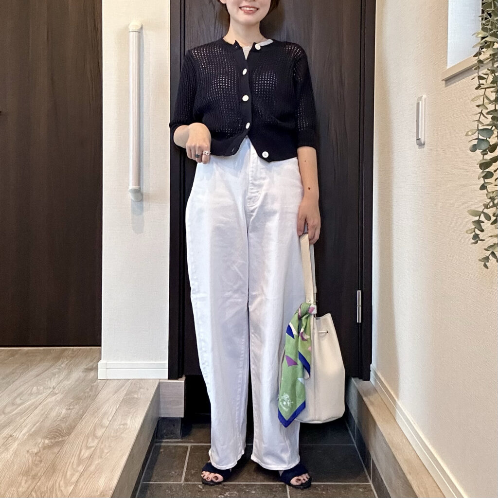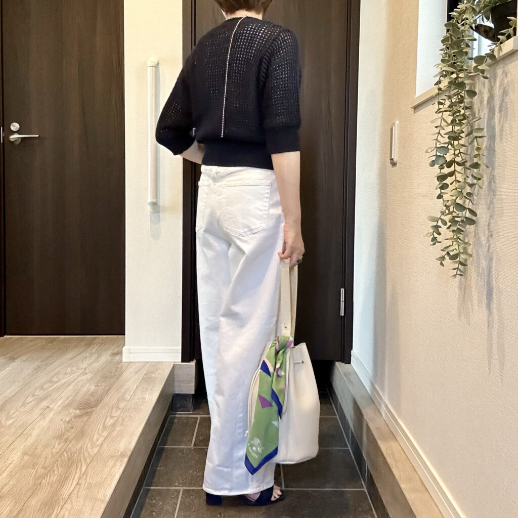 晴れの日に白いボトムスを楽しんでおこうと思い、Rie Mirrerの白のワイドデニムを主役にコーデを組んでみました。