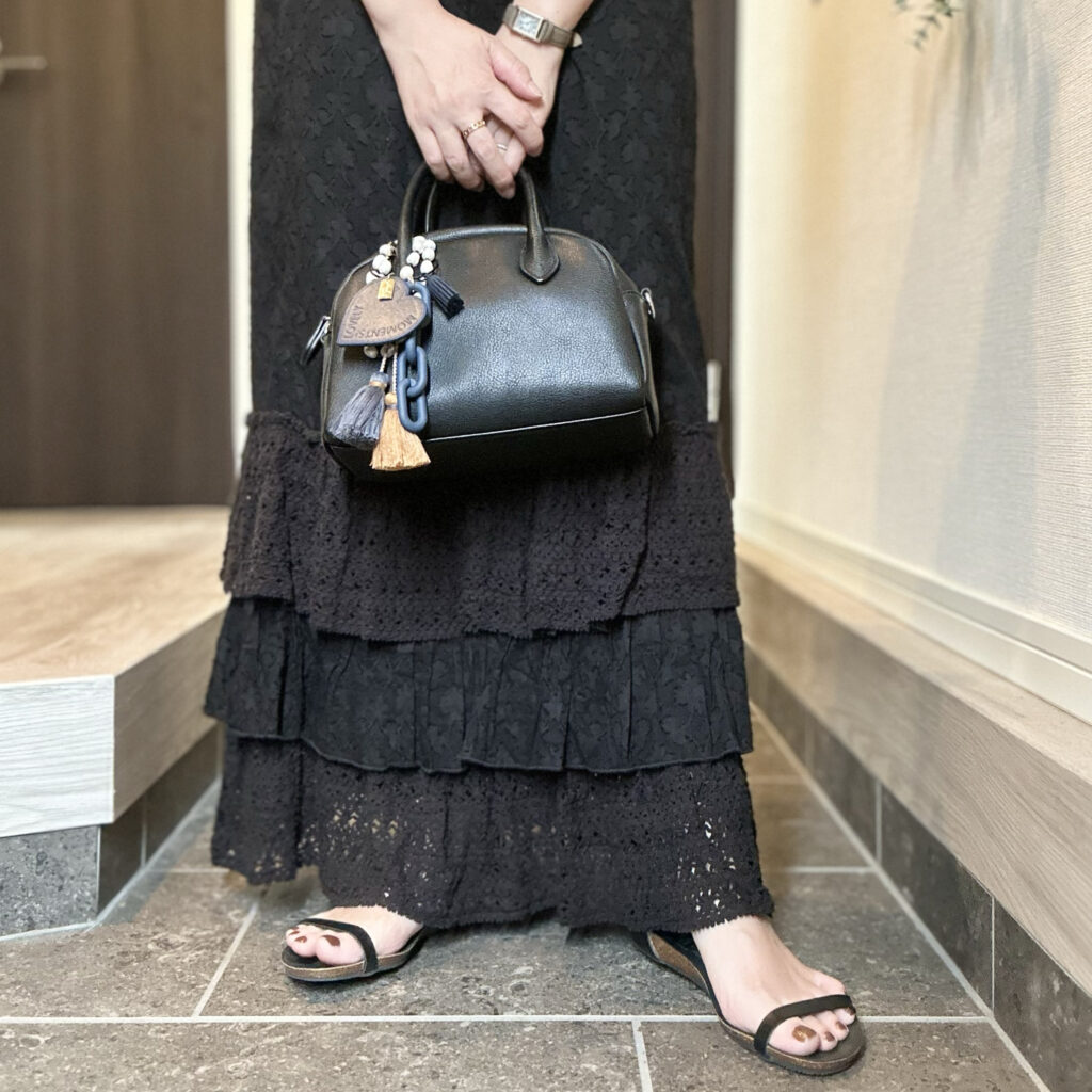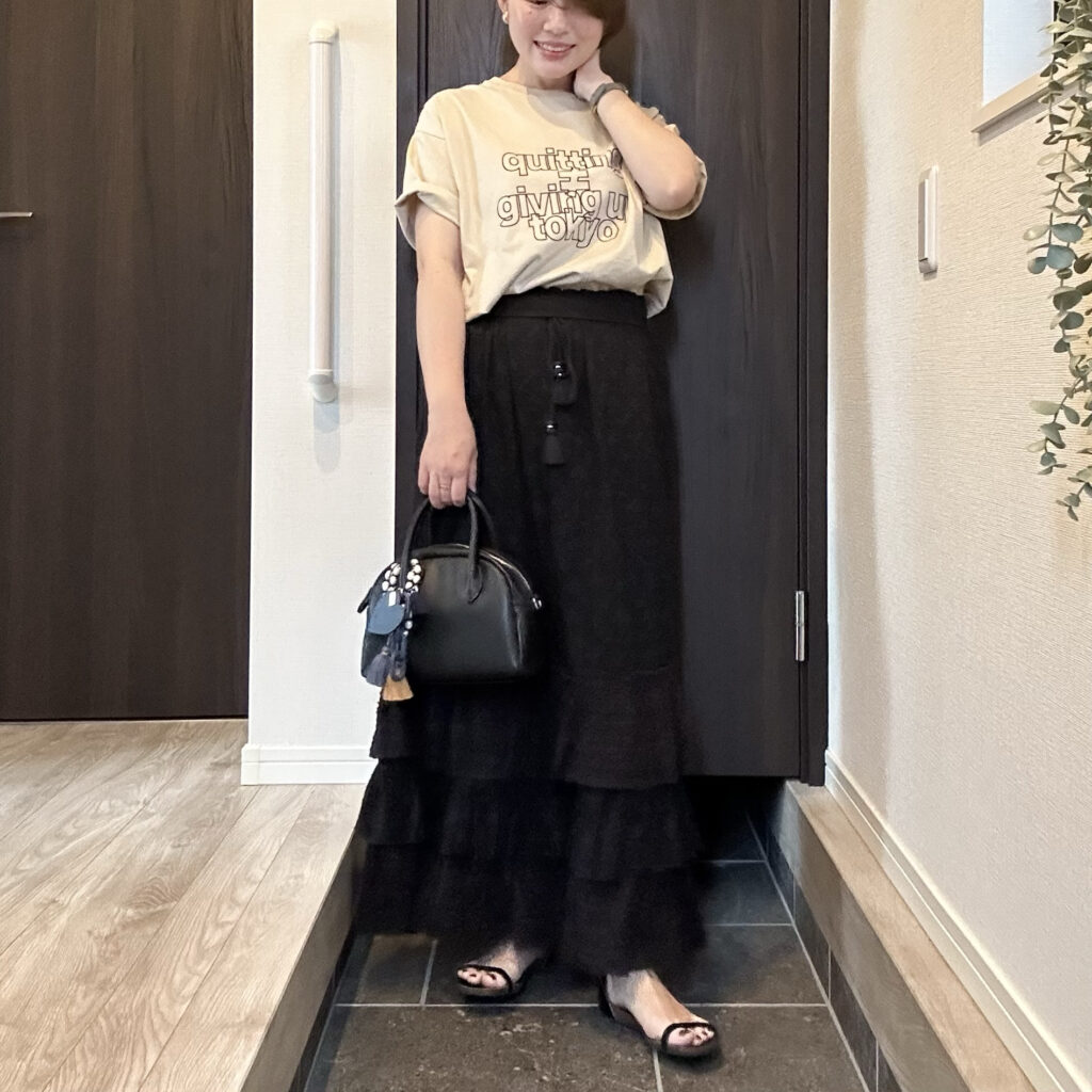 スカートがフリフリっと重めのシルエットなので、足元は黒の細ストラップサンダルにして抜け感を出しました。