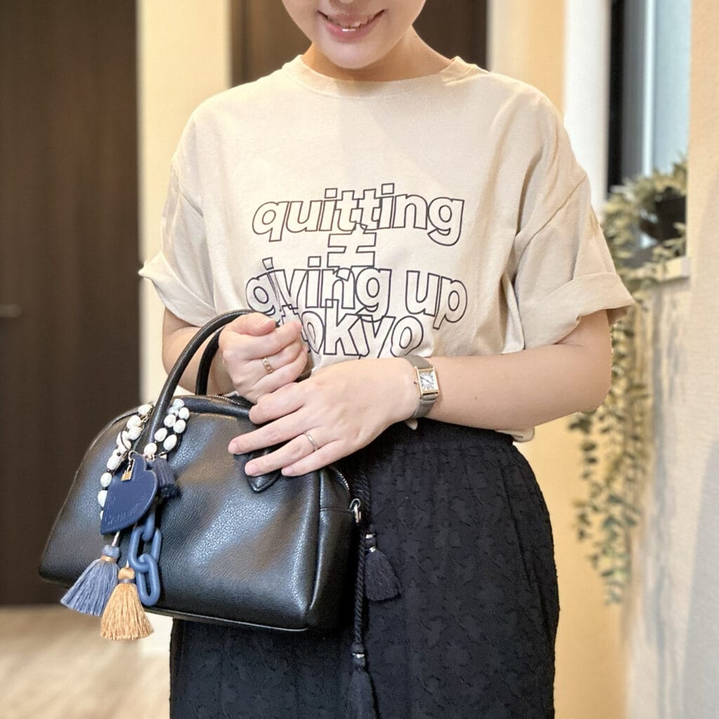バッグにはお気に入りのチャームやパールネックレスを着けてじゃらづけを楽しんでいます♪