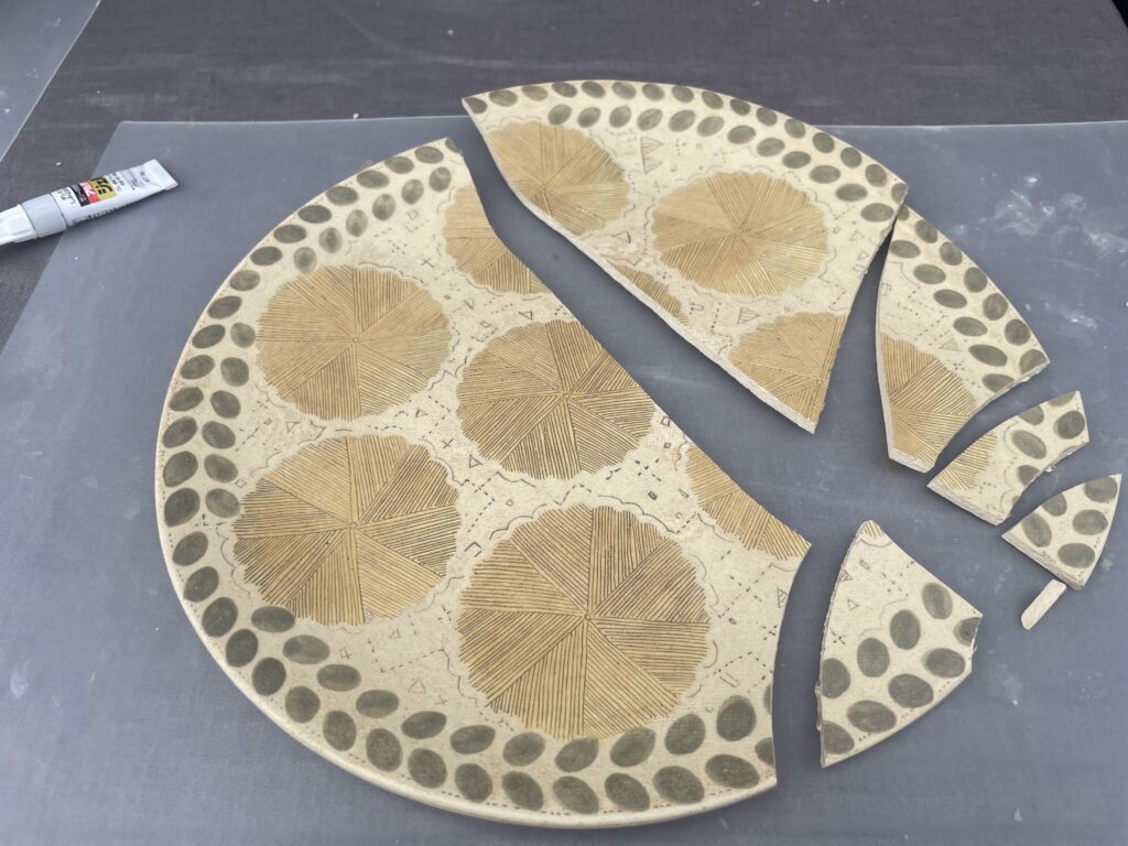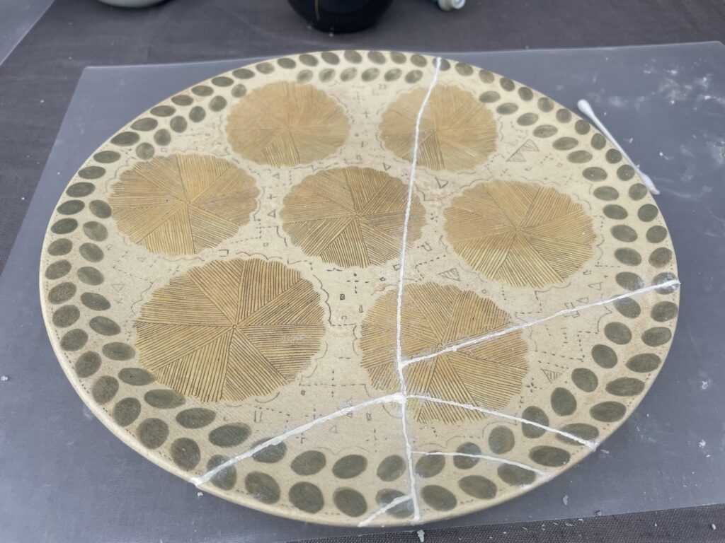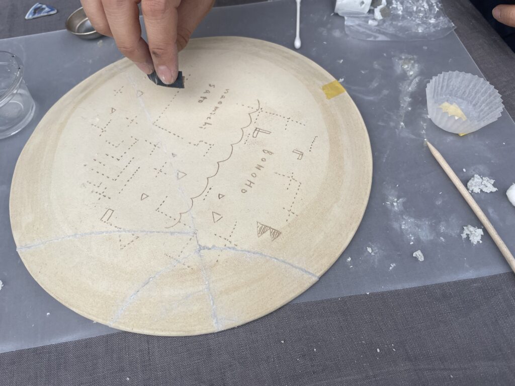 初参加の6月は、佐藤尚理さん作陶の大皿を持って行きました。そうなんです…。こちらの大皿、今年の春に買ったばかりなのに、こんなことに…。Chat GPTに相談したところ、「金継ぎで直せますよ」と提案され、渡りに船でこのワークショップを見つけ、予約不要&ちょうどタイミングがバッチリ合って、駆け込みました…!
