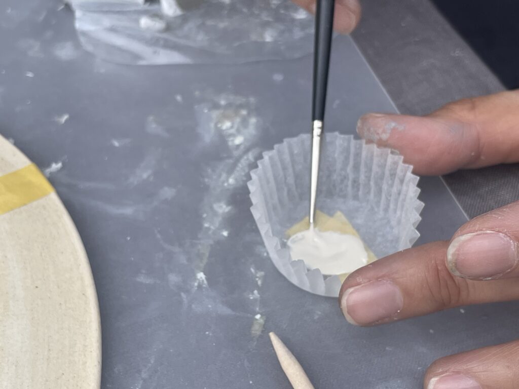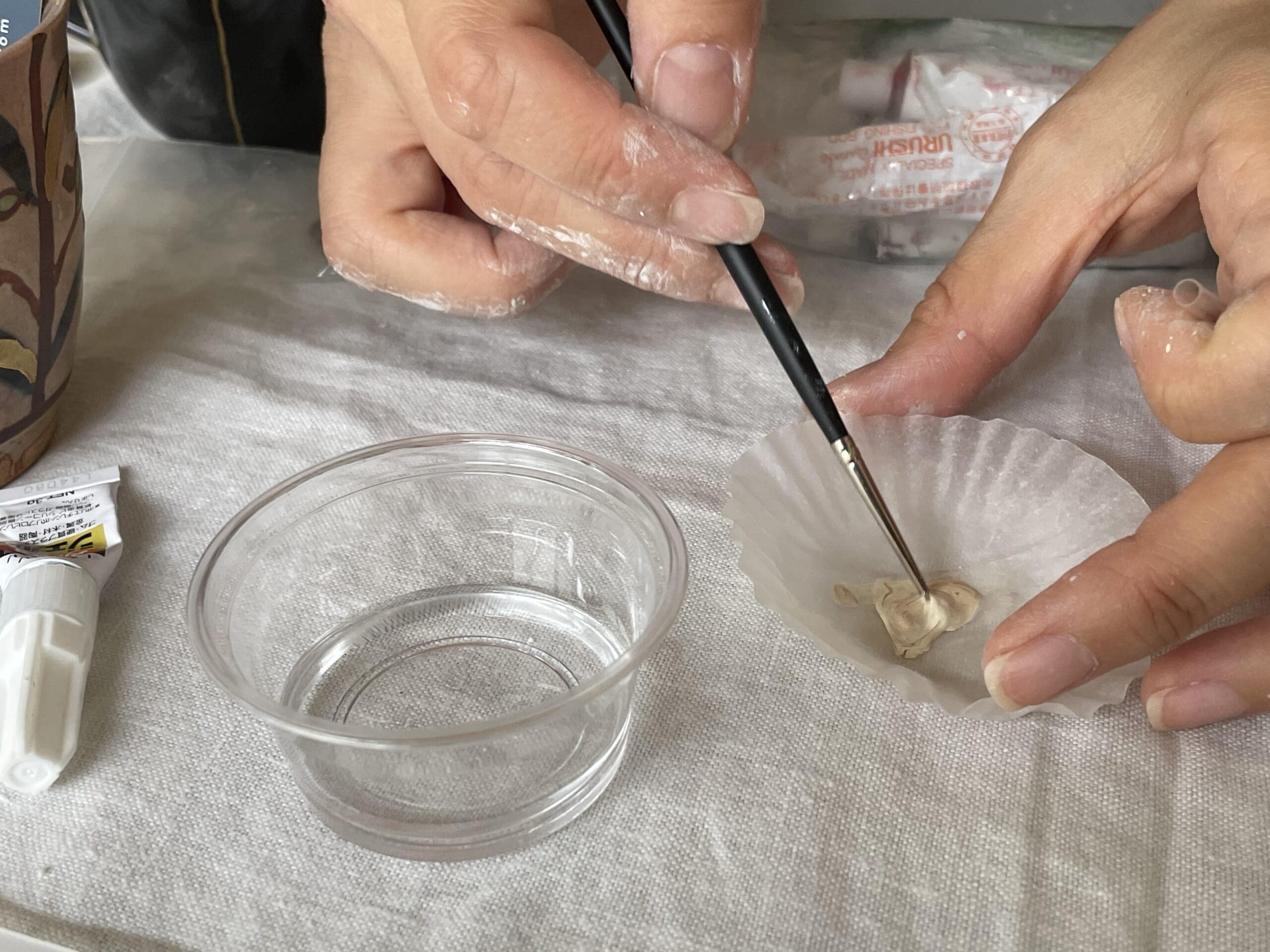 専用の薄め液を使って、新漆を調合します。手荒れせず、質感は本漆に近いのが嬉しいポイント。漆の色は、金色、銀色、黒、白を選ぶことができ、私は白の漆をセレクト。
