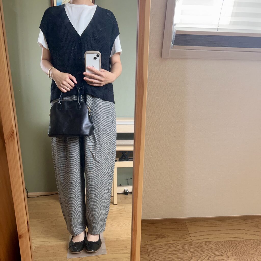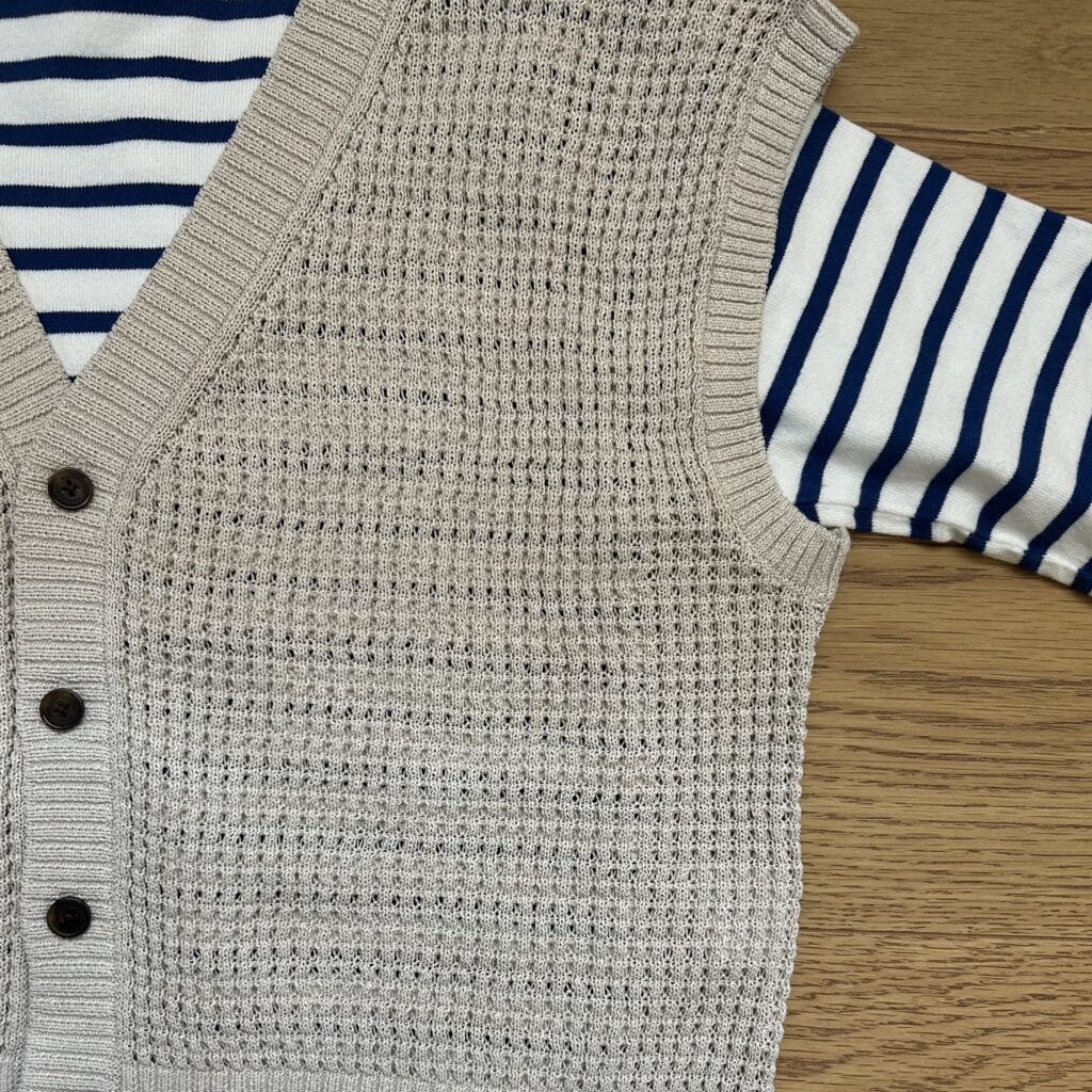 ペーパー混素材で、シンプルなデザインのVネックニットベスト。シャリ感があり、涼しく着られます。半袖や長袖に合わせるのはもちろん、中にタンクトップを着てノースリーブ風に着たり、ワンピースにも合わせられる。長いシーズン着用できるのではないかと思います。自宅で手洗いできるのも◎です。サイズはレディースの2、メンズの6の2種類です。