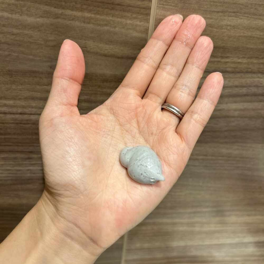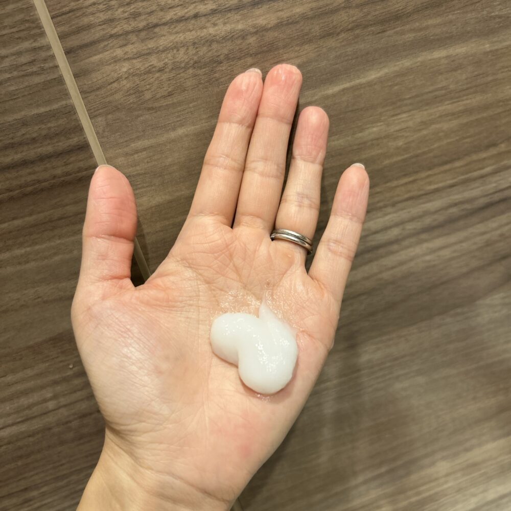 もったりとした液状クリームにスクラブの粒が入ったテクスチャー。使用方法は週に1度、シャンプー前の乾いた状態の髪に根元から塗ります。ドライヘアに馴染ませるために、クリームを少し手で温めてから根元に塗ると滑りが良かったです!地肌に塗り3~5分放置後、お湯で少しクリームを溶かしながら頭皮をやさしくマッサージしてから洗い流します。指の腹でゆーっくりマッサージすると気持ちいいです。