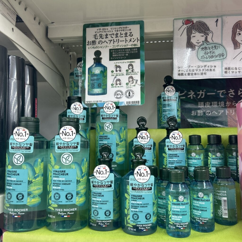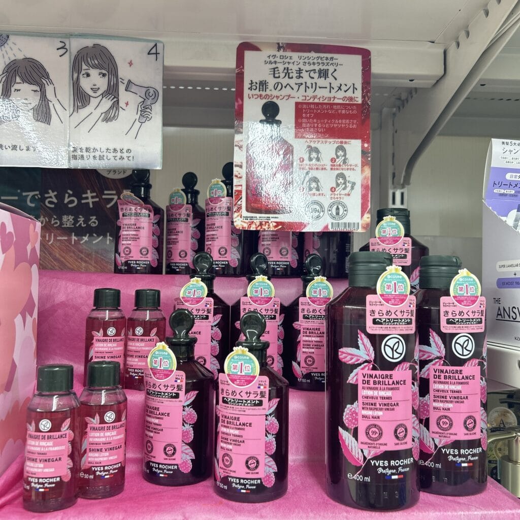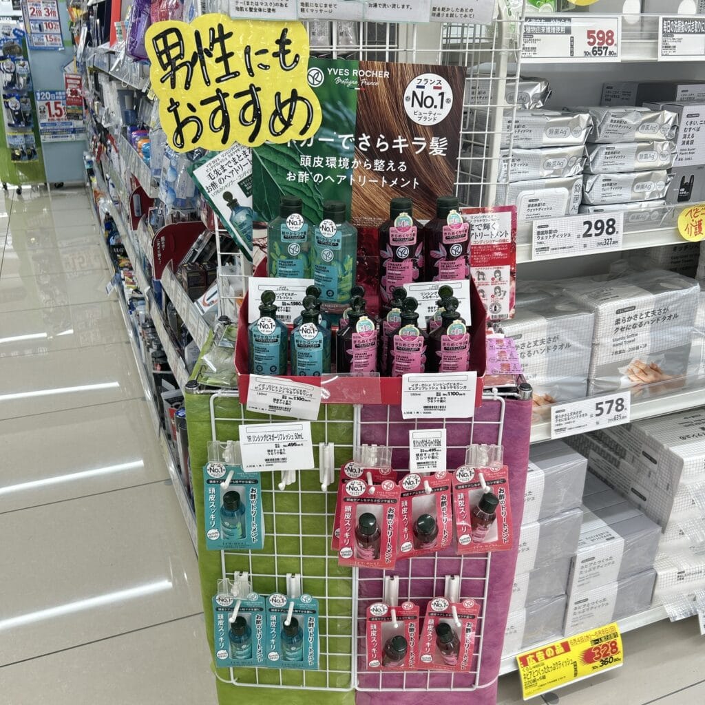 こちらのシャンプートリートメントブースでは、リンシングビネガーがピックアップされていて、容量違いで3タイプ置いてありました。私が紹介したサイズ以外にも、小さいサイズは旅行用やお試し用にぴったり!家族で使う方やロングヘアの方は大きいサイズもあります!
