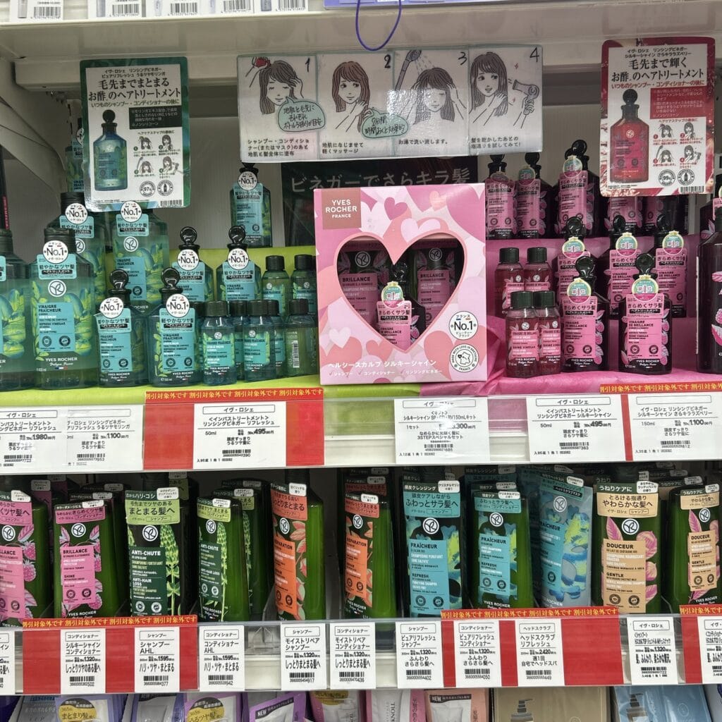 いくつかのウエルシアでは、こういったイヴ・ロシェブースだけではなく、通常のシャンプートリートメントコーナーにもイヴ・ロシェを置いているそうです。ブースがない店舗に行った方はそちらに行くとあるかも◎ ちなみにそこで見つけたギフトセット(写真上部のハートボックス)がめちゃくちゃ可愛くて、贈り物に悩んだ時にこれにしようと思いました!年齢問わず喜んでもらえそう!