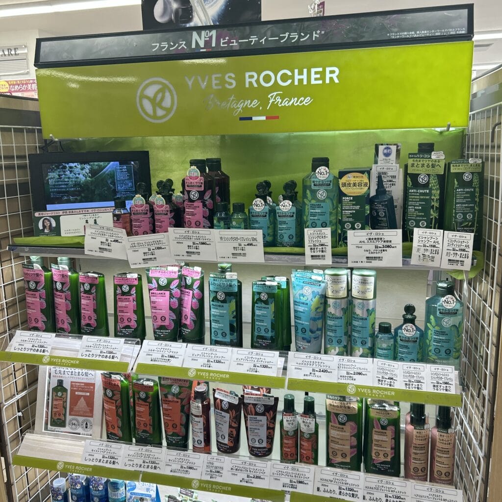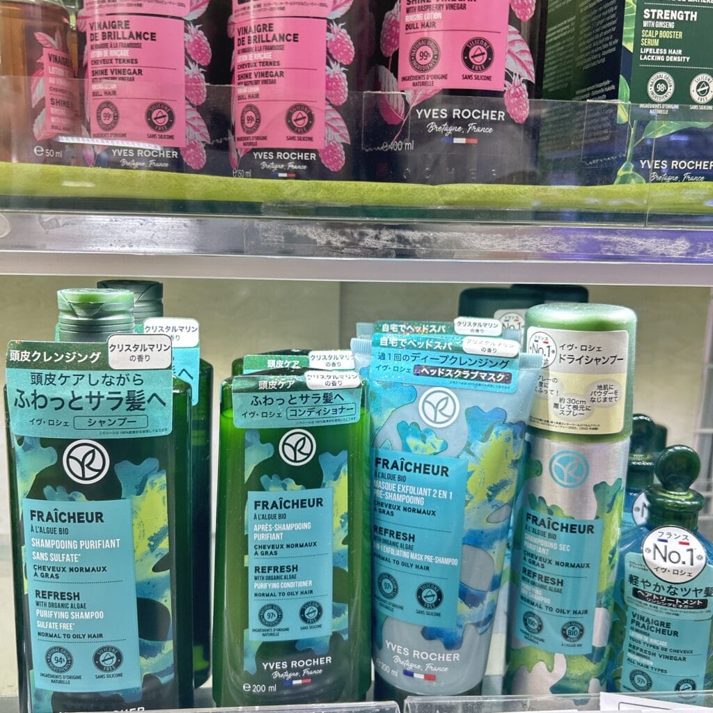 どこにあるかな~っと思い入店すると、入ってすぐにイヴ・ロシェが♡ ポップにある通り、このシリーズは本当に男性にもおすすめ!頭皮の匂いを気にしている夫がかなりピュアリフレッシュシリーズを気に入っているのも納得!