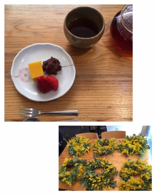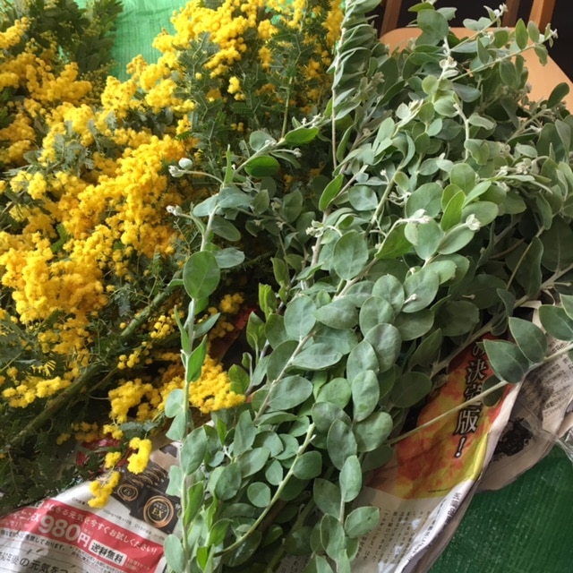 ミモザのリース、花をつぶさないようにワイヤーを巻くのが難しかったです・・。