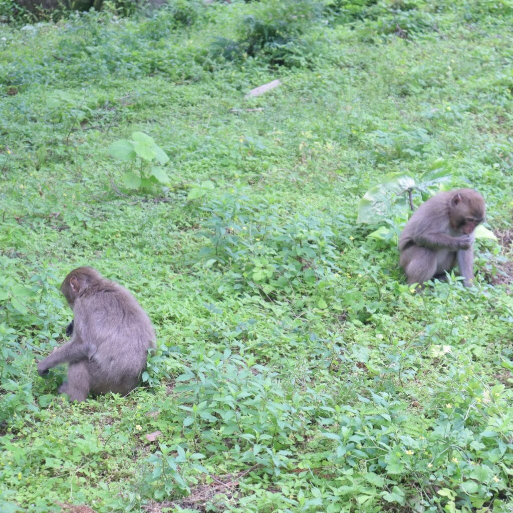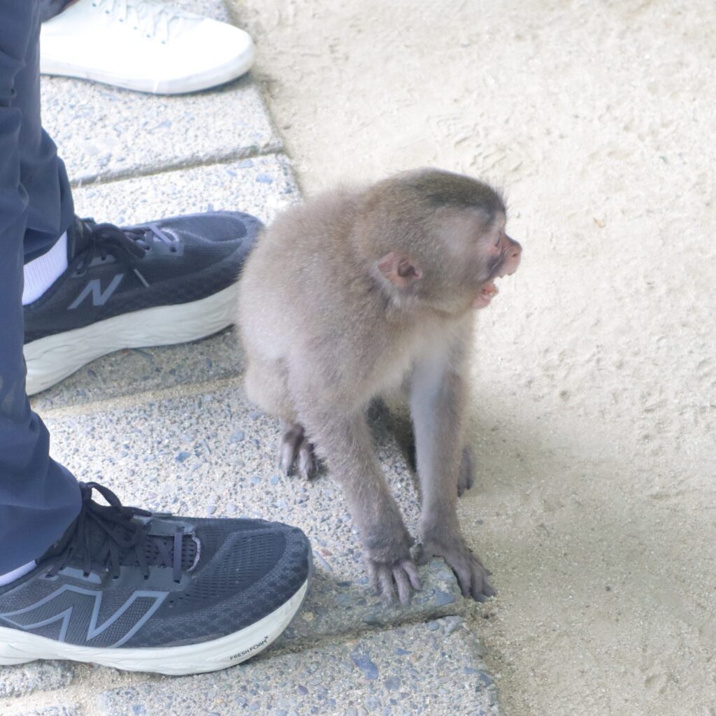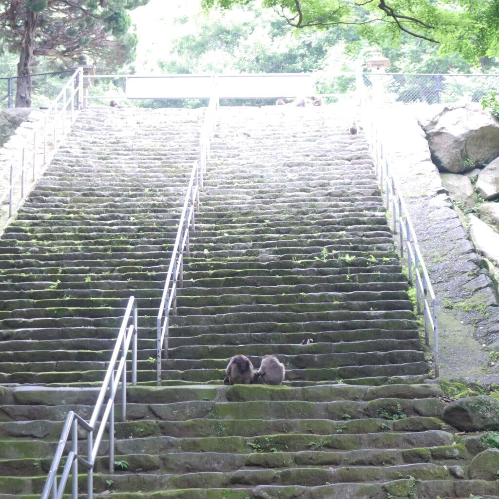 入場口を進み、しばらくすると階段が見えてくるのですが、すでに猿がいる!!