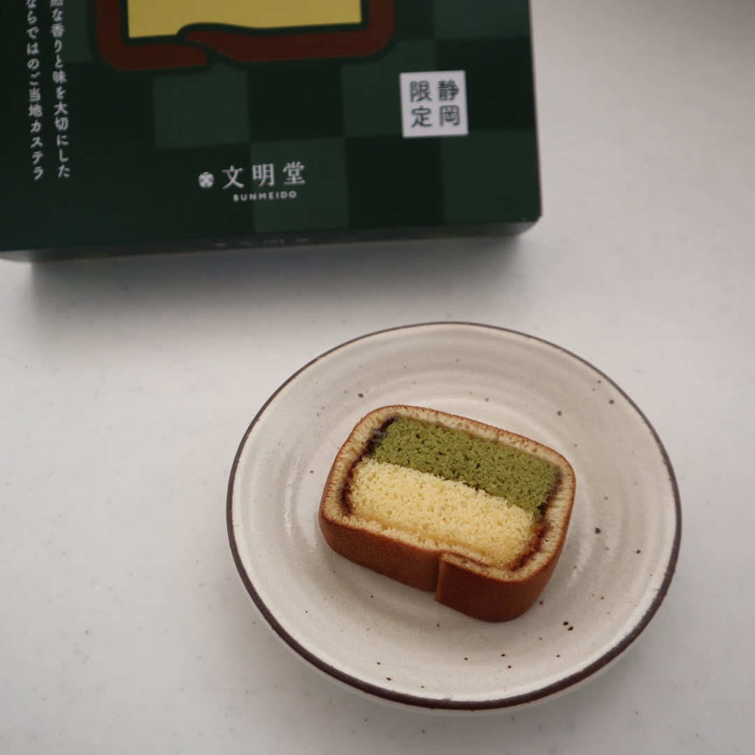 カステラは2層になっていて、「静岡茶カステラ」と文明堂伝統の味「ハニーカステラ」が一度に楽しめるようになっているそうです♪