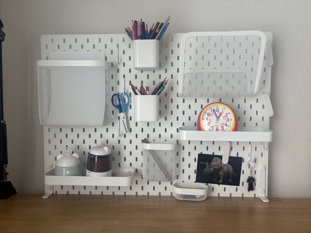 文房具や公文のプリントなど収納しています。筆記用具もすぐ手に取れて、子どもが自分でお片付けもしやすくなりました。