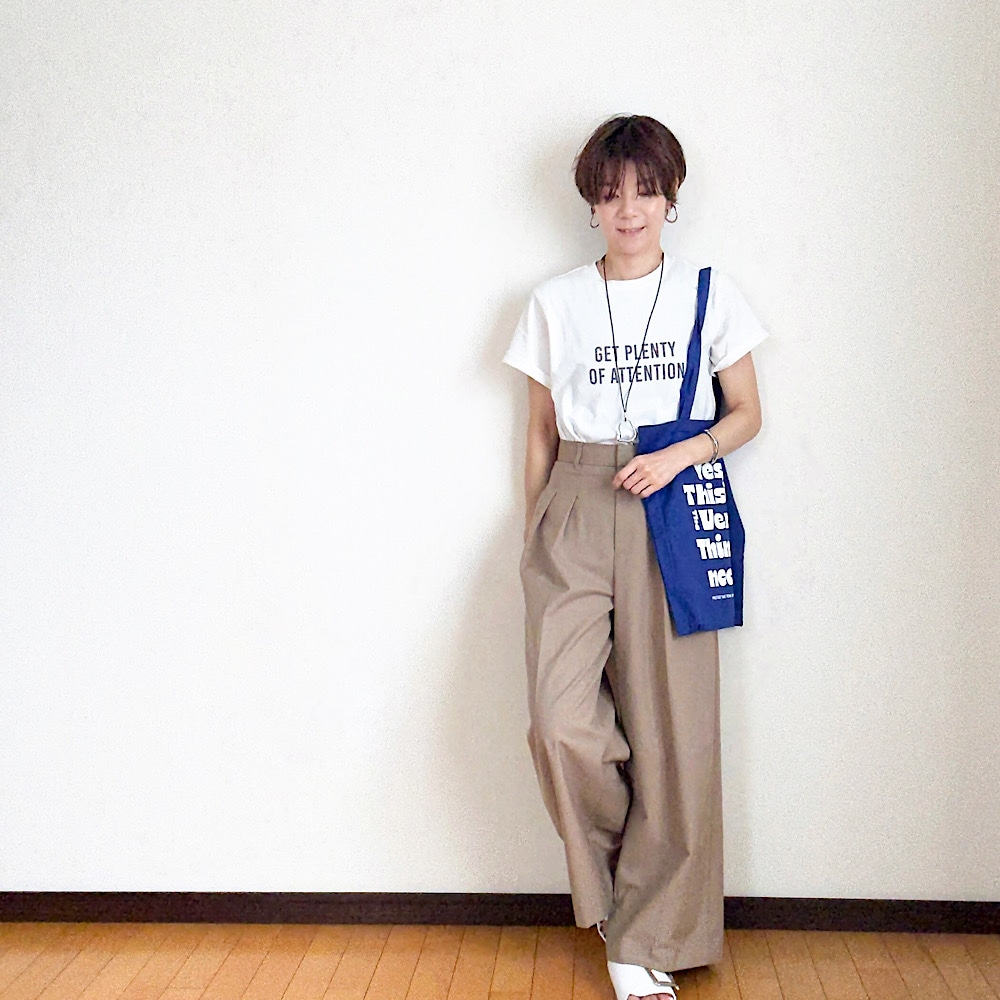 白T×ベージュパンツの柔らかコーデにも、ブルーの差し色が良いアクセントになります♪