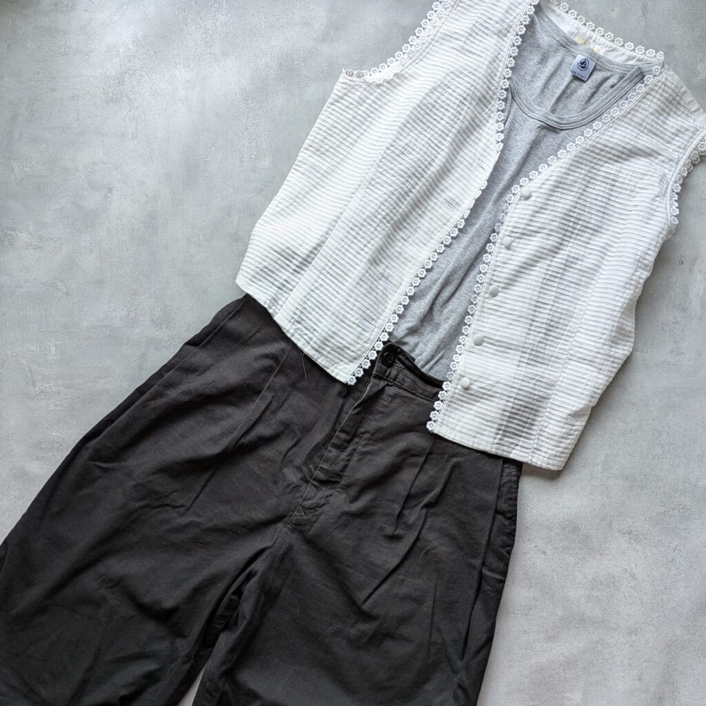 あまりにシンプルで落ち着かず、古着のジレを羽織りました。