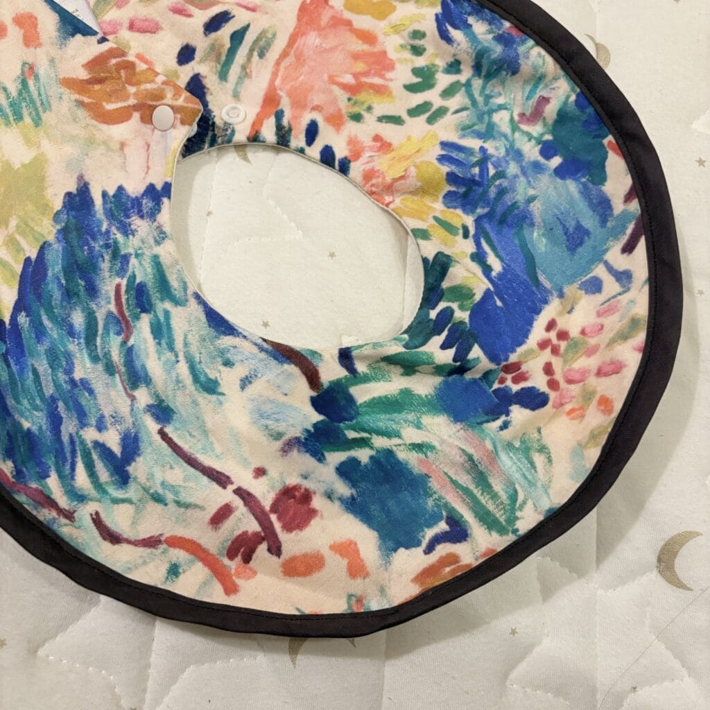 着用した様子はこちら。わかりやすいようにマティスのモチーフを後ろ側に。丸いスタイが付け襟みたいでお洋服のワンポイントになります。