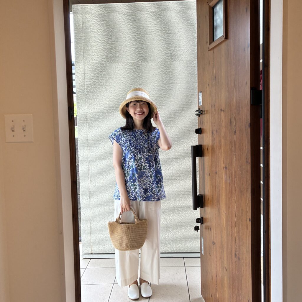 ブラウス:シップス、パンツ:トロワ、靴:モードカオリ、鞄:エルベシャプリエ、帽子:オリエント、鞄:メゾンキーズ