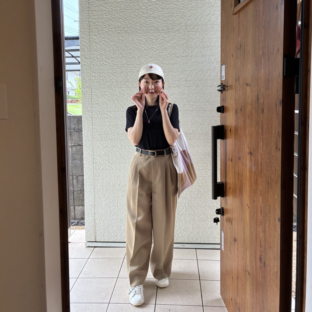 Tシャツ:ユナイテッドアローズ、ズボン:マッキントッシュフィロソフィー、ベルト:ラルフローレン、帽子:広島カープ、ネックレス:子どもと作ったやつ、靴:スタンスミス、鞄:マリメッコ