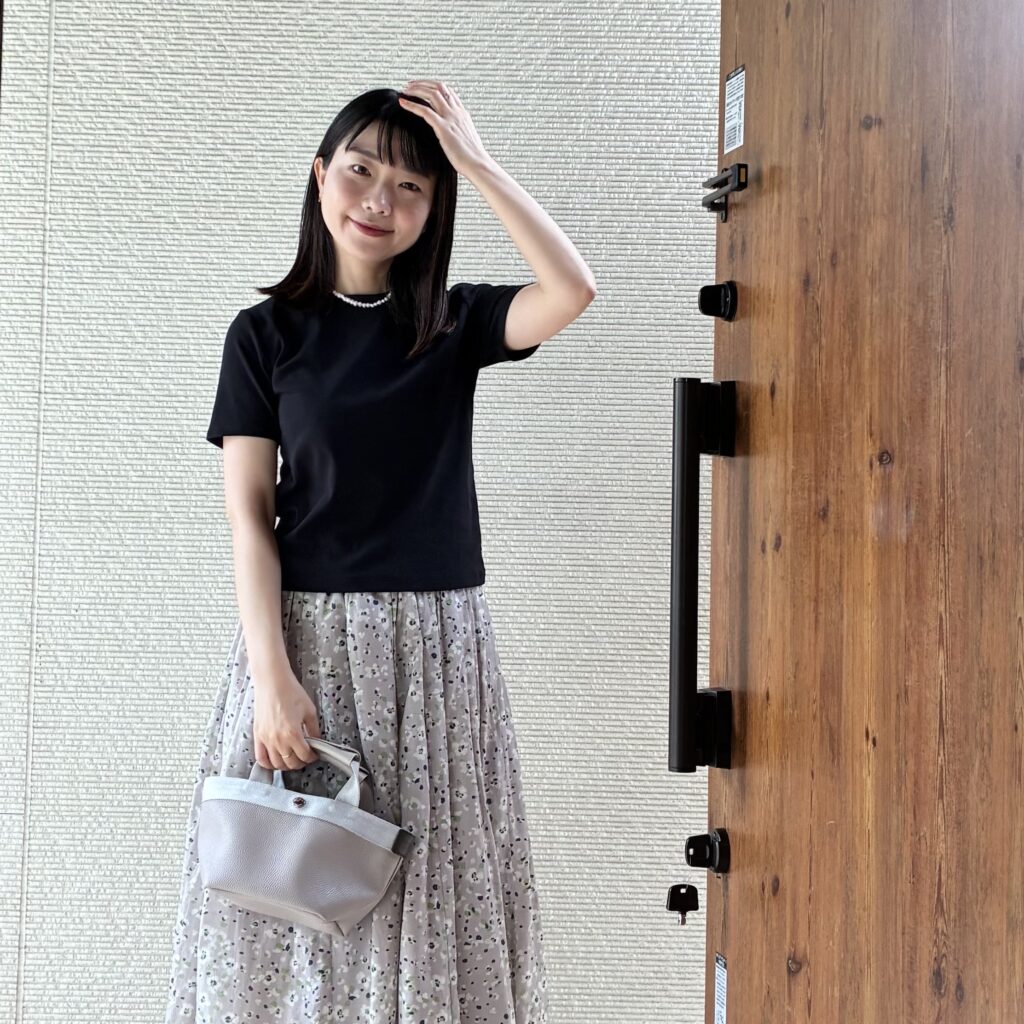 Tシャツ:ユナイテッドアローズ、スカート:ファヌル、鞄:エルベシャプリエ、ネックレス:ヒューマンウーマン