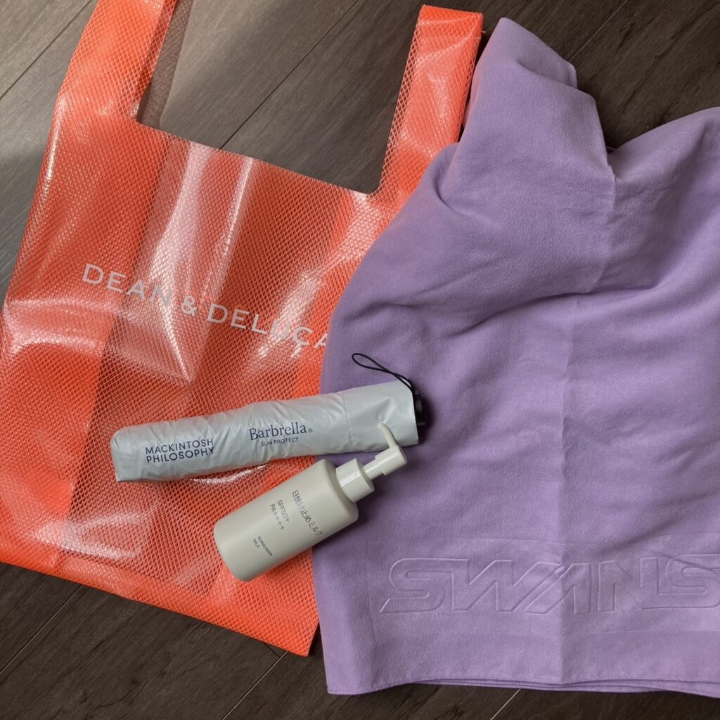 小物はDEAN&DELUCAのビニールバック、無印良品の日焼け止めミルク、マッキントッシュフィロソフィーの日傘、軽くてコンパクトなSWANSの速乾バスタオル。