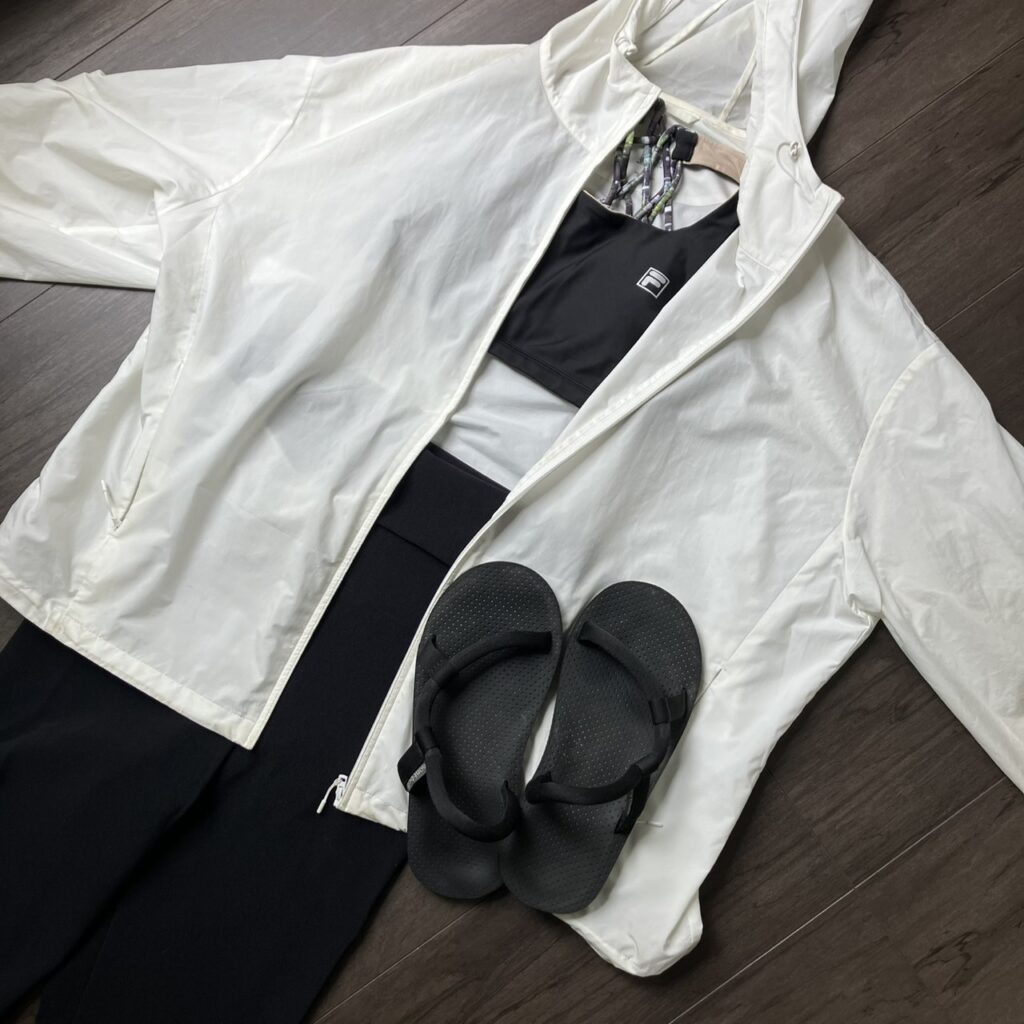 そしてヘビロテして、だいぶ汚れていますがユニクロのポケッタブルUVカットパーカーと、5年以上愛用しているモンベルサンダル!