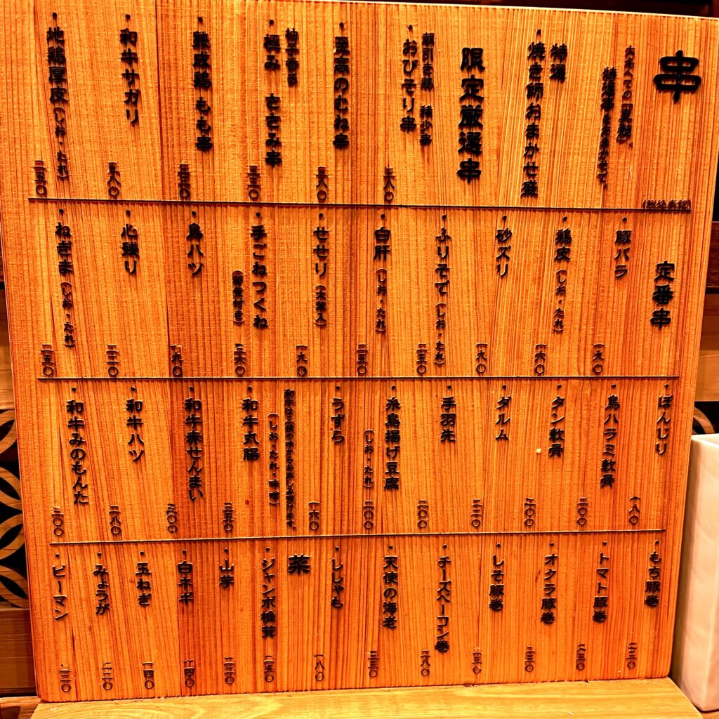 今回注文した焼鳥は「豚バラ」「心残り」「和牛丸腸」「地鶏厚皮」「砂ずり」「おびそり串」などなど。