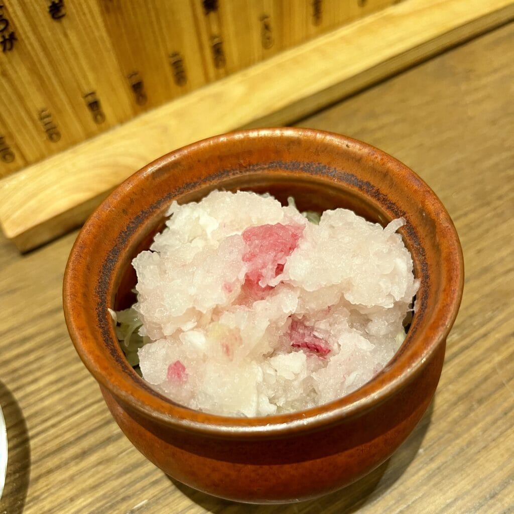 焼き鳥の付け合わせ、福岡ではたれがかかったキャベツがモリモリ!が定番なのですが、「大名 へて」さんはキャベツと大根の酢漬けが出てきます。