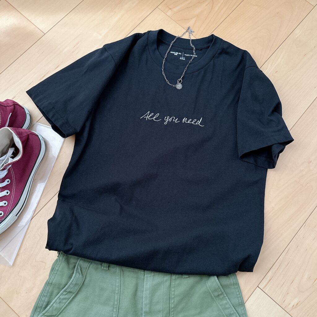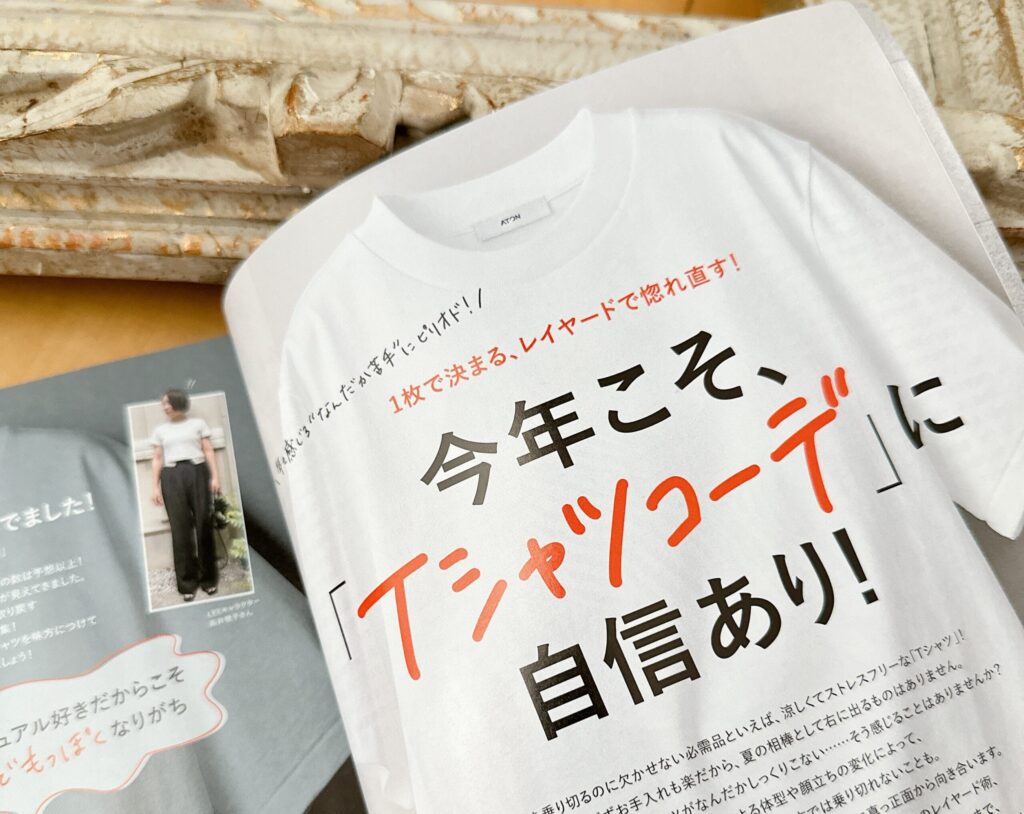 まさに「これだ♡」ということで、LEE7月号を参考に、地味色Tシャツに“ちょい盛り”のパターンを組んでみました!