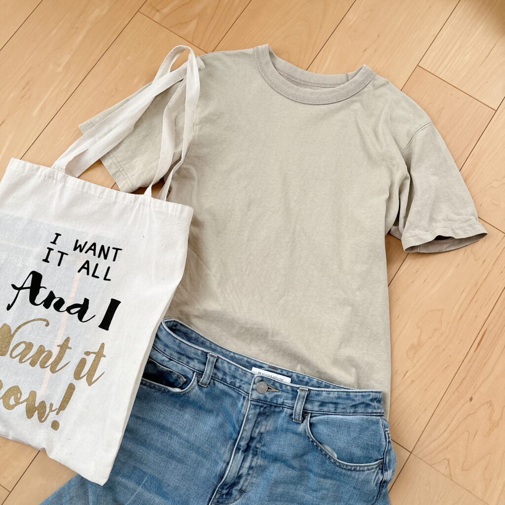 \パターン3/ ベージュTシャツと淡色デニム
