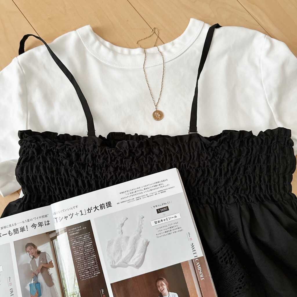 今号のLEEで紹介の「Tシャツ+甘めキャミソール」
