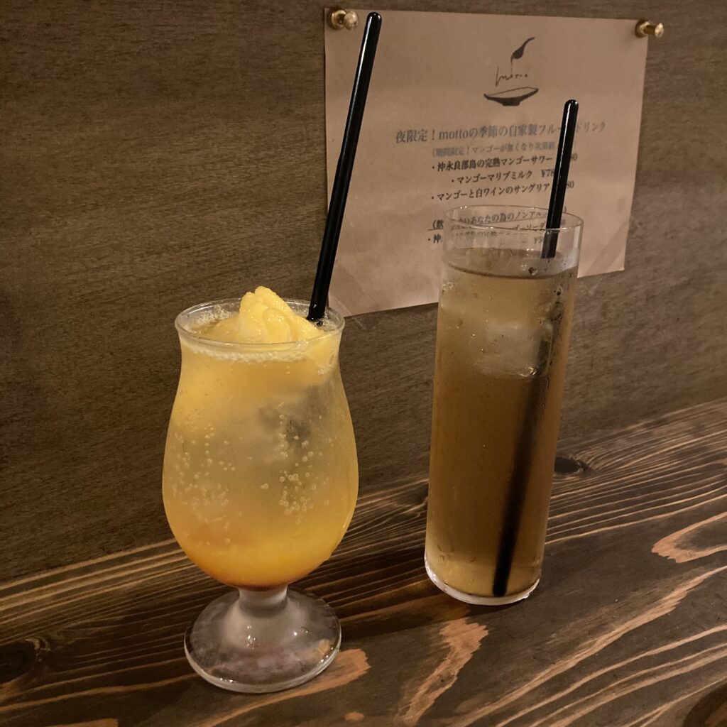 飲みの物を選ぶにも、どれも美味しそうで迷う迷う。おしまりちゃんは中国酒ライチジャスミン、わたしはノンアルの沖永良部島の完熟マンゴーソーダにて乾杯♪