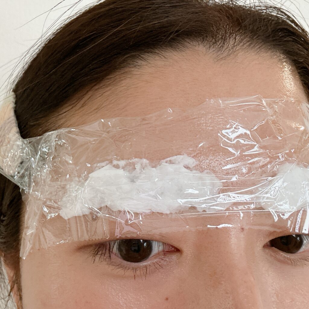 密着度を高める&髪の毛に付かないようにするためにラップを貼って「宅配便、今はこないで~」と思いながら待機。