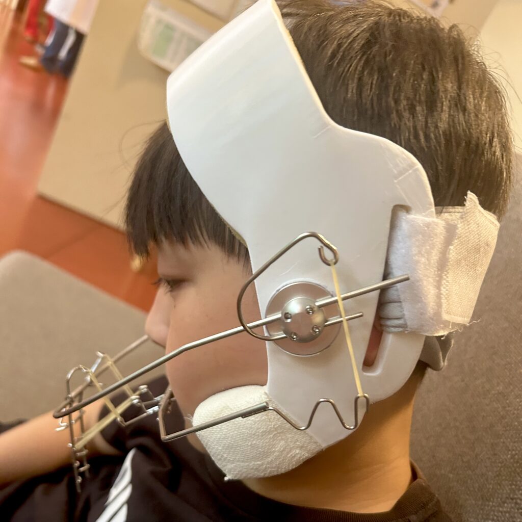 通院は3週間に1回ほど。(頻度は個人の症状や治療状況によって異なります。)日々の装着によって少しずつ動いてきた上顎に対してヘッドギアのワイヤー部分を先生がペンチで曲げたり、ゴムをかける位置を変えたりと微調整をしてくださいます。