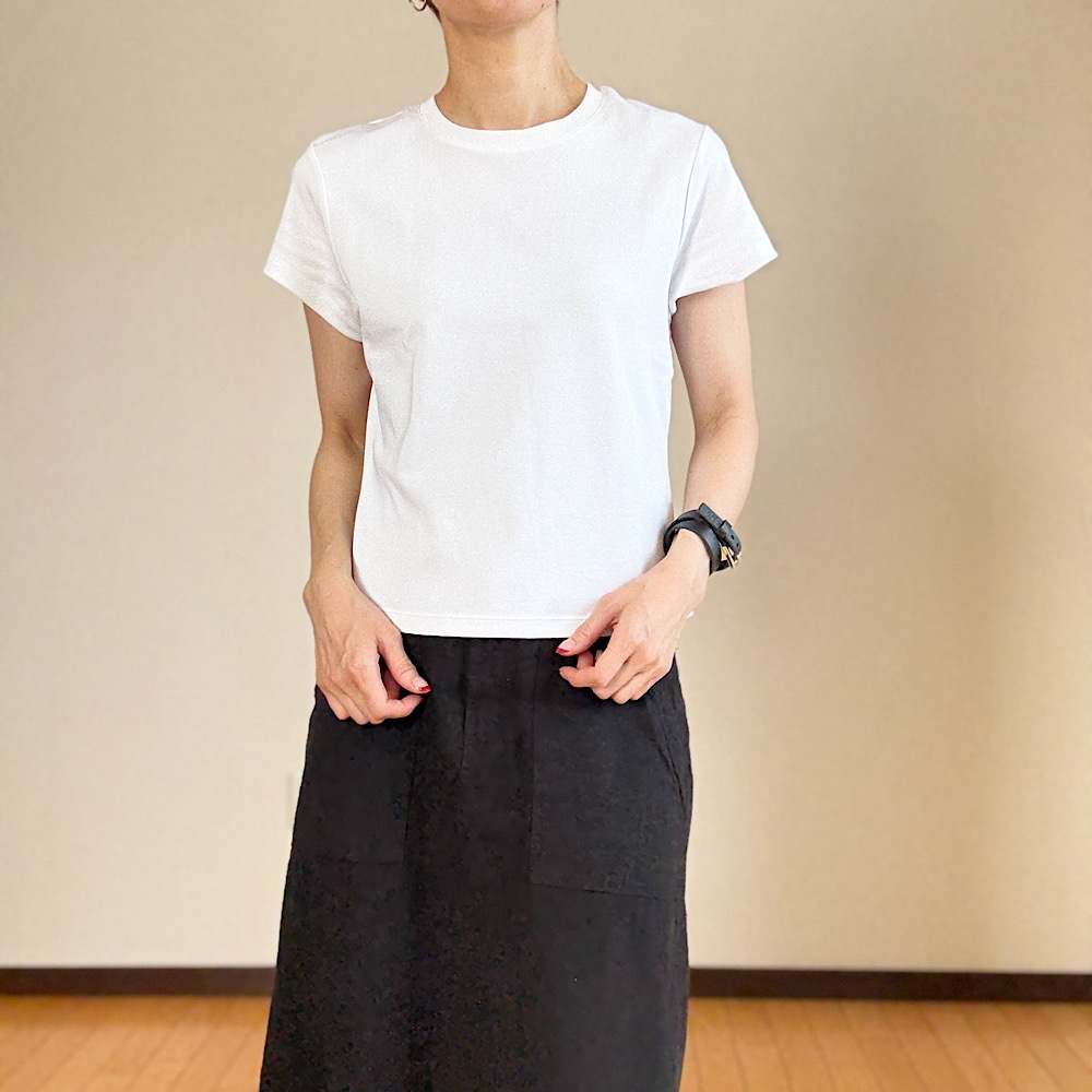 気になり店舗で手に取ってみると、ほどよくハリがあって肌触りが良い!と感じ、かつ袖のデザインが半袖とフレンチの中間くらい!?というのも気に入り、白を購入しました。