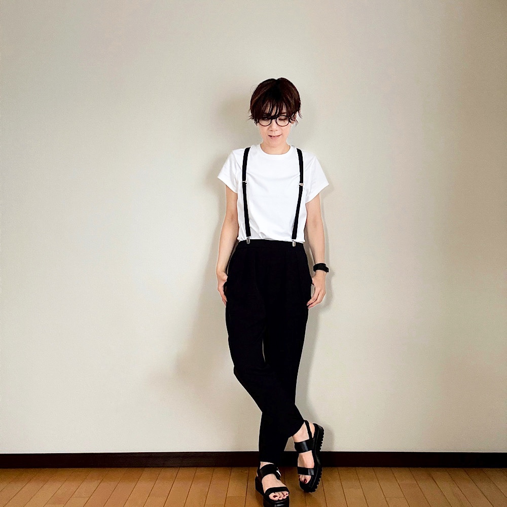 黒のパンツにアクセサリーの代わりとしてサスペンダーを足し、シンプルなコーデだけど、少し手を加えた印象を与えるコーデ。