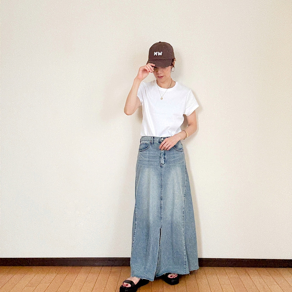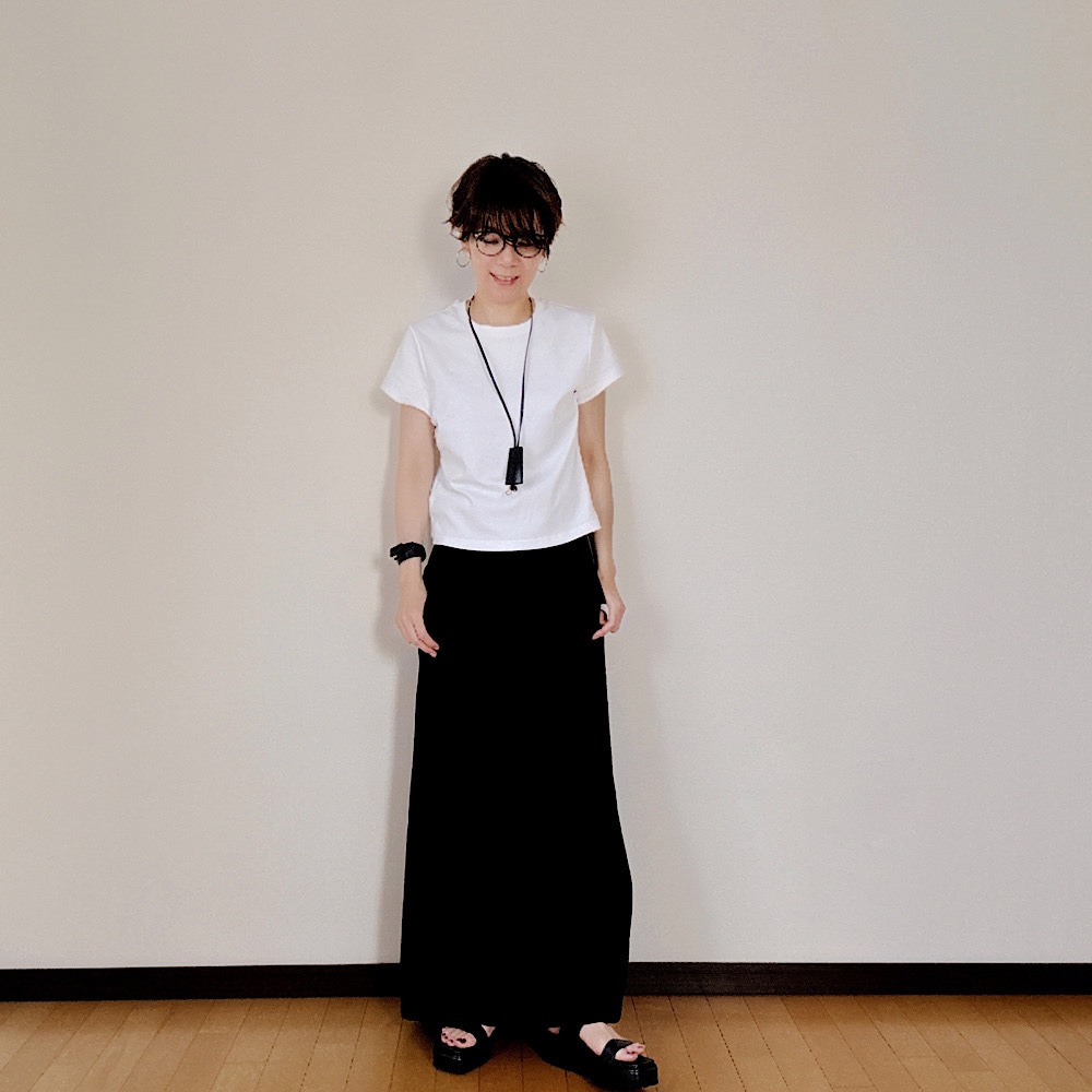 スカートはリネン混なのでTシャツと合わせてゆるっとなりすぎるところを、アクセサリーやサンダルで引き締めたコーデに。