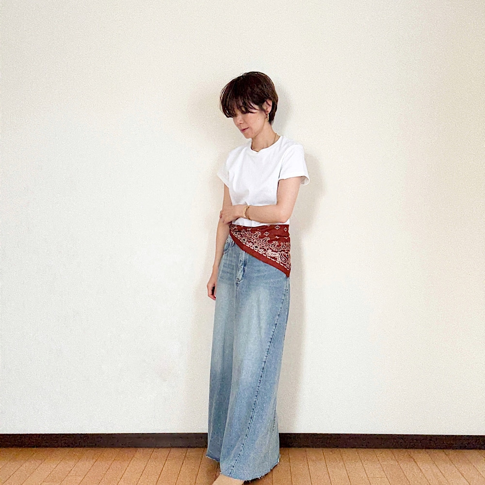バンダナを腰に巻いて、夏らしい雰囲気に。足元はミュールで女性らしさも忘れずに。