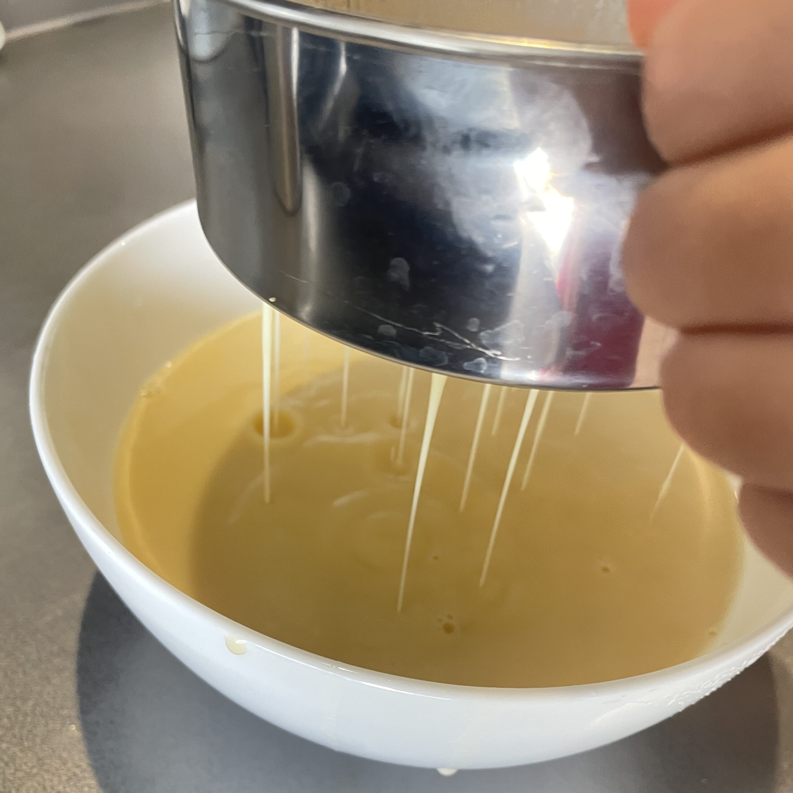 混ぜ終えたら、これを濾して(ここで無理に残った白身を濾し切らないのが我が家のポイントです)、
