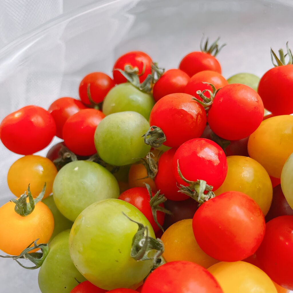 袋にぎっしり詰まった、赤、黄、緑…と宝石のようにキラキラしたカラフルなミニトマト。