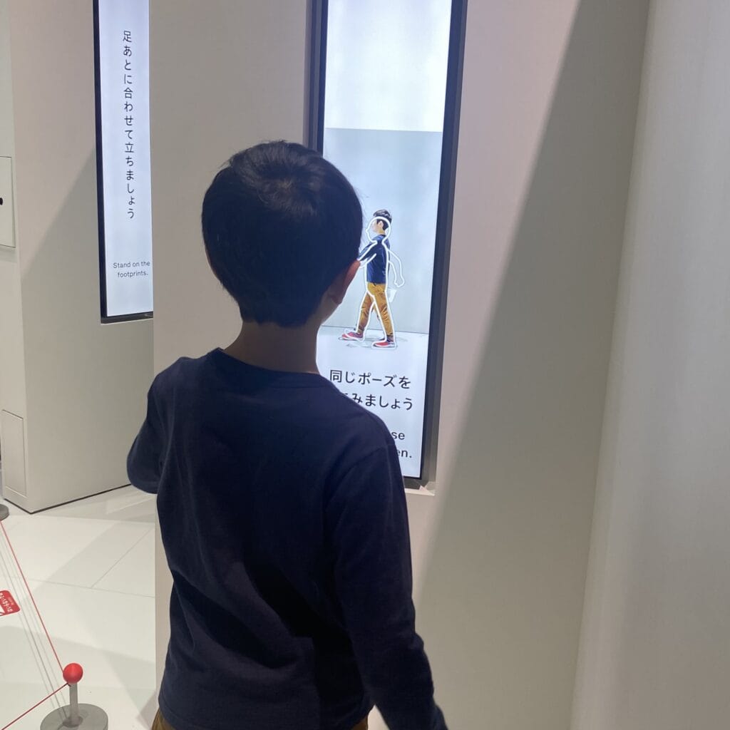 いくつかブースがあり、そこに入ると指定されたポーズをとるよう指示され撮影されます。その後スクリーンを見てみると、微妙にポーズが異なる何人もの写真がパラパラ漫画のように次々入れ替わって映し出されることで、歩いているように見えるという展示でした。