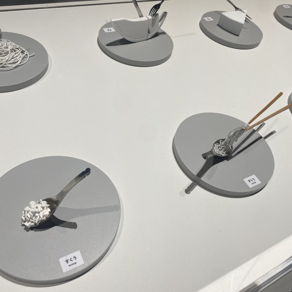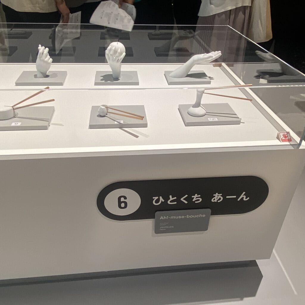 はじめに目に飛び込んできたのは、白い手のオブジェが並んだショーケース。「すくう」と一口に言っても、スプーンですくうのか、お箸ですくうのか、スープをすくうのか…などなど色々なパターンがありますよね。「すくう」「さす」「きる」など、食べることにまつわる動詞の動きを展示していました。